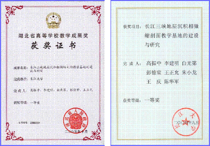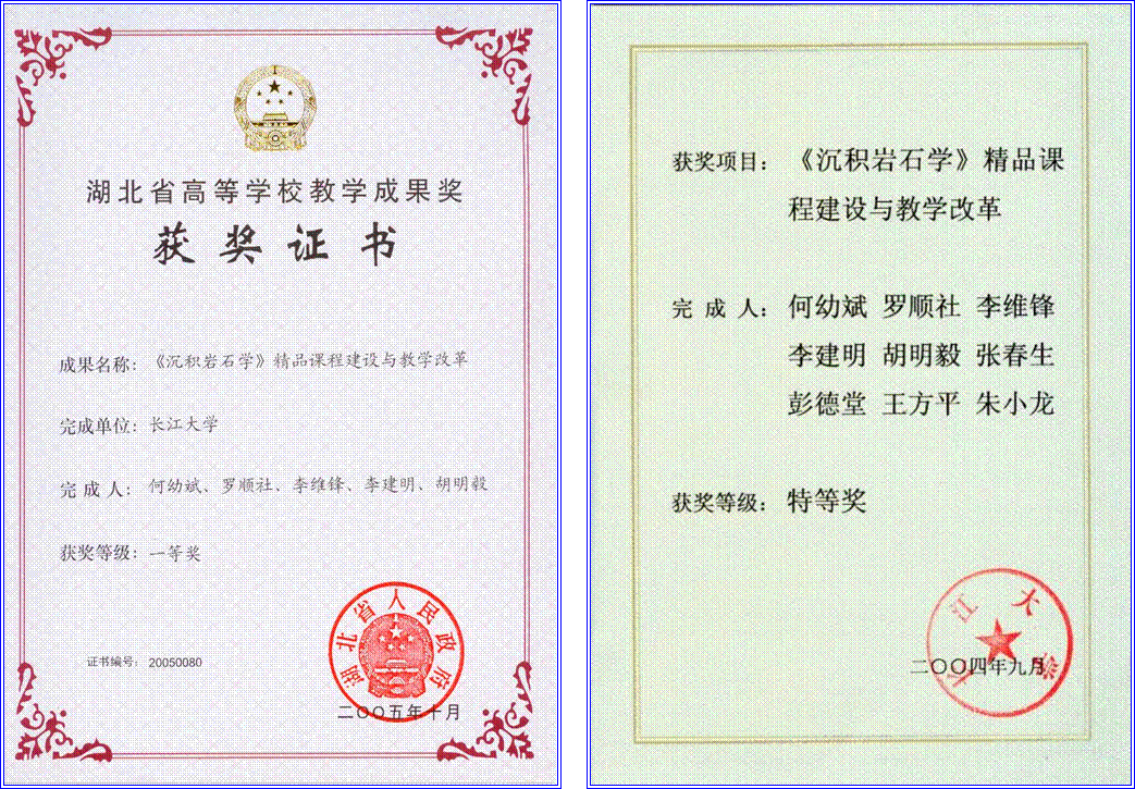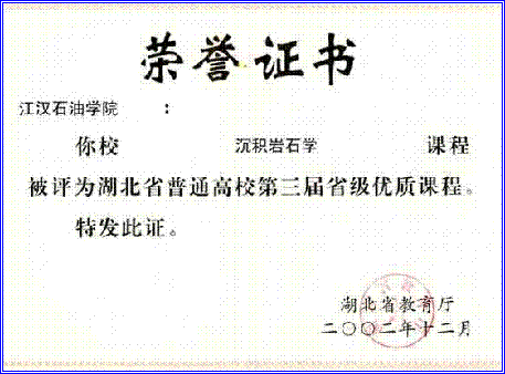 2002年,《沉积岩石学》被评为湖北省普通高校第三届省级优质课程,2003年被评为省级精品课程。