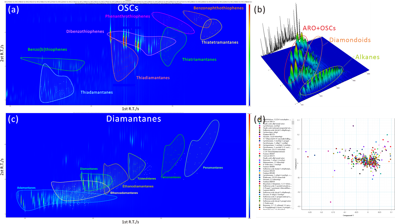 GC×GC-TOFMS检出原油中不同分子标志物指纹特征及油油对比组学分析。(a)有机含硫化合物;(b)金刚烷系列;(c)总离子流三维图;(d)PCA组学对比