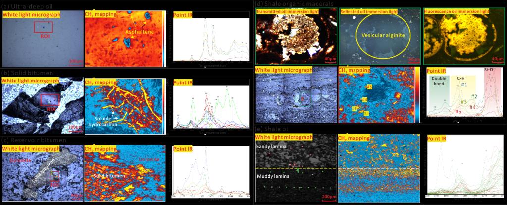 光热红外光谱检出不同类型样品中有机质红外光谱官能团结构与空间分布非均质性特征。(a)超深层原油;(b)原油裂解沥青;(c)储层高演化沥青;(d)页岩有机显微组分;(e)页岩油赋存特征
