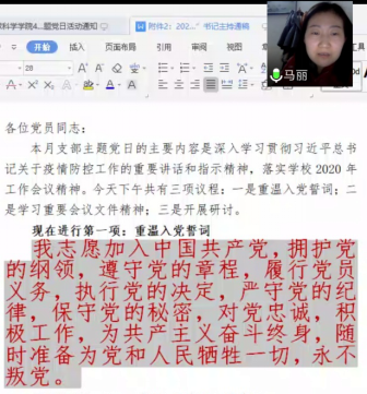 活动第二阶段为支部主题党日活动。由于科级干部调整,原来机关党支部组织委员王宁调出日本无码av ,重新推举郭霖同志为组织委员。各位党员自觉交纳了4月党费,并在马书记带领下,全体党员利用屏幕共享和手机语音重温了入党誓词,这也是疫情防控工作中一次特别的党员宣誓。紧接着,大家集中学习重要会议文件精神:3月4日中共中央政治局常务委员会会议精神、3月6日决战决胜脱贫攻坚座谈会精神、习近平在湖北省考察新冠肺炎疫情防控工作时的讲话精神、3月18日中共中央政治局常务委员会会议精神、3月27日中共中央政治局会议精神和学校2020年工作会议精神。随后,马书记传达了学院4月份中心组学习及党委扩大会议精神,主要通报了2020年日本无码av 的重点工作,对近期的重点工作进行提醒。活动最后,大家还围绕“结合疫情防控谈共产党员如何在学校双一流建设中发挥作用”开展研讨。每位机关人员都结合自己的实际从疫情防控、日常工作、学科和学院发展3个方面进行讨论,并达成一致工作态度:保安全、抓落实、谋发展。