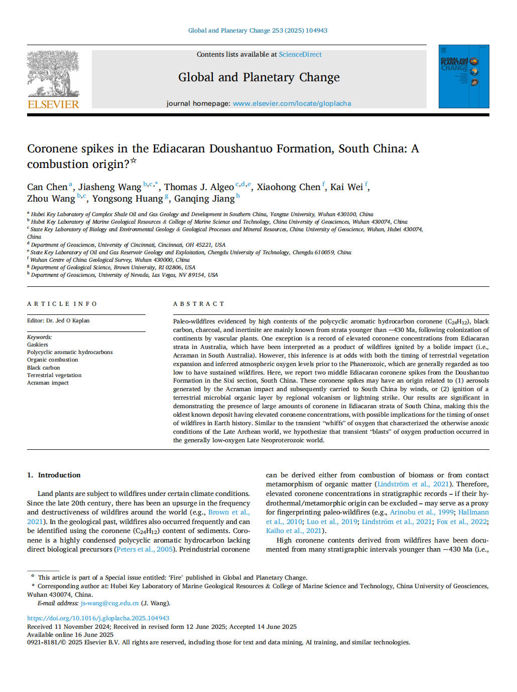 古野火在地层中的记录主要表现为高含量的多环芳烃晕苯(C24H12)、黑碳、木炭和惰质体等,且主要出现在约430Ma之后(即维管植物殖民大陆之后)的地层。然而,其中一个例外是澳大利亚埃迪卡拉纪地层中记录到的晕苯浓度升高现象,该现象曾被解释为由陨石撞击(即南澳大利亚的Acraman陨石坑)引发的野火产物。然而,这一推论不仅与陆地植被扩张的时间不符,也与显生宙之前推断的大气氧气水平相矛盾。