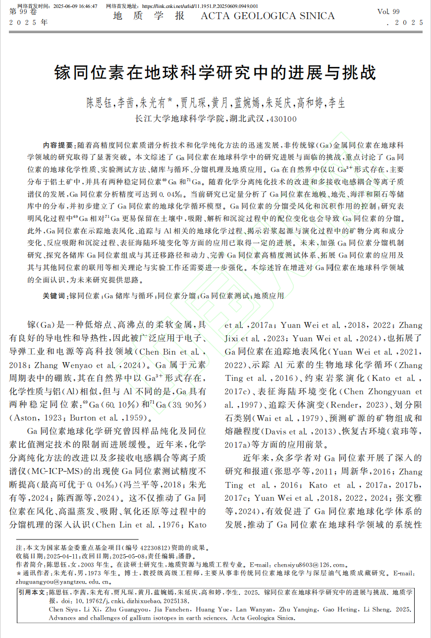 师生,本科生陈思钰为论文第一作者,其导师朱光有教授为通讯作者。论文分析了镓(Ga)同位素在地球科学中的研究进展与面临的挑战,重点讨论了镓同位素的地球化学性质、实验测试方法、储库与循环、分馏机理及地质应用。