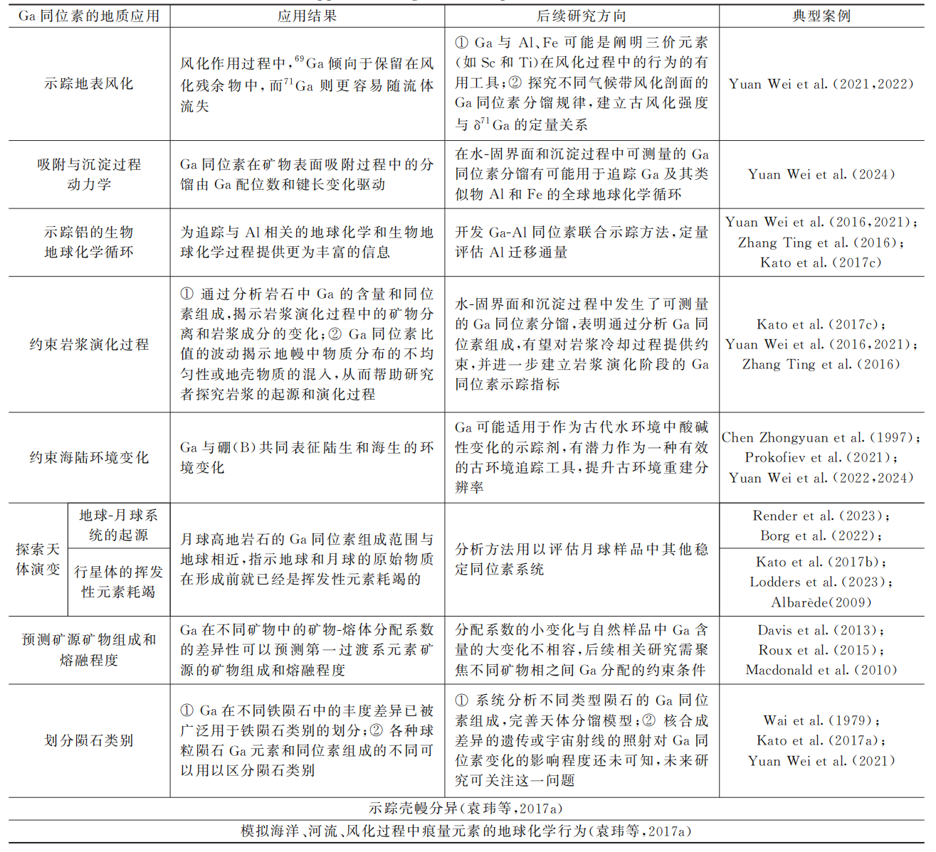 镓是一种低熔点、高沸点的柔软金属,具有良好的导电性和导热性,因此被广泛应用于电子、导弹工业和电源等高科技领域。镓同位素地球化学研究曾因样品纯化及同位素比值测定技术的限制而进展缓慢。近年来,化学分离纯化方法的改进以及多接收电感耦合等离子质谱仪(MC-ICP-MS)的出现使Ga同位素测试精度不断提高。不仅推动了镓同位素在风化、高温蒸发、吸附、氧化还原等过程中的分馏机理的深入认识,也拓展了镓同位素在追踪地表风化、约束岩浆演化、表征海陆环境变化、追踪天体演变、划分陨石类别、预测矿源的矿物组成和熔融程度、恢复古环境等方面的应用前景。