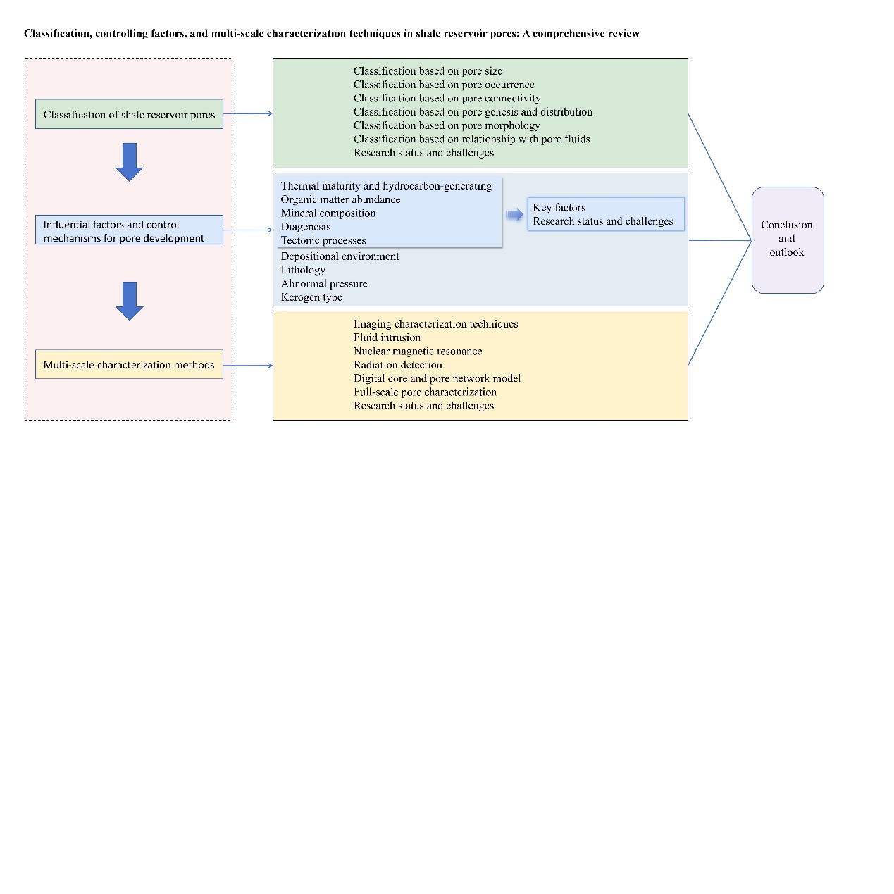 本研究从孔隙大小、产状、连通性、成因和分布、形态、与孔隙流体的关系等诸多角度对孔隙分类方案进行了分析。将热成熟度、有机质丰度和矿物组成、成岩作用以及构造运动确定为影响页岩储层孔隙形成和发育的关键因素。基于成像技术的图像分析法、流体注入方法、核磁共振、射线探测、数字岩心法和孔隙网络模型法,以及多尺度联合表征法等,提升了精确表征页岩孔隙的能力。