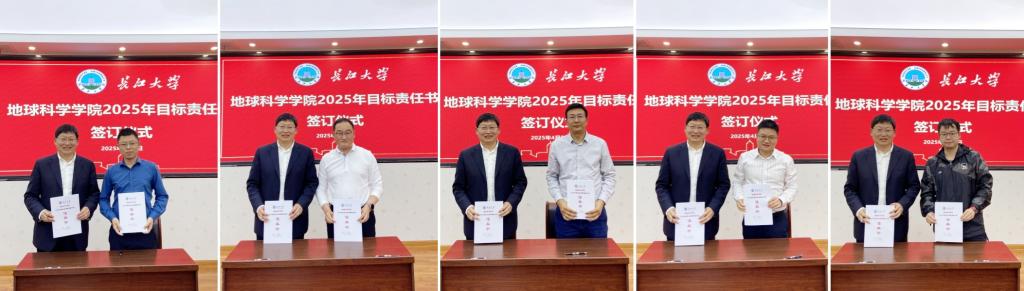 为增强全院教师发展的使命感,明晰职责和任务,学院举行了2025年各系(中心)目标管理责任书签订仪式,石油系主任饶松,地质系主任李涛,地信系主任刘远刚,地科系主任刘彬,实验中心代表郭晋威依次上台与朱光有院长签订2025年各系目标管理责任书。