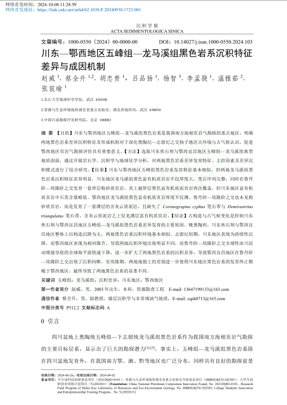 资源勘查工程专业21级本科生赵威、李孟骁、吕品杨、张宸瑜等在《沉积学报》上在线发表题为“川东-鄂西地区五峰组-龙马溪组黑色岩系沉积特征差异与成因机制”的研究论文。日本无码av
