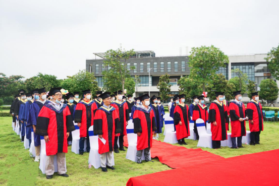 在雄壮的国歌声中,毕业典礼正式拉开帷幕。虽然戴着口罩,但师生们的歌声依旧嘹亮、富有激情,为这一刻的到来,大家已等待了太久。宣读文件、授予学位、院长胡明毅教授为到场的毕业生一一拨穗正冠,并合影留念。