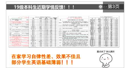 在主题班会开始之前,罗老师对开学以来19级本科生的网络学习情况及上学期期末考试情况分别进行了通告与分析,得出线上学习存在自律性差、学习效果不佳和日本无码av 19级本科生英语基础薄弱的现状,引导家长、学生重视英语学习和四级备考。