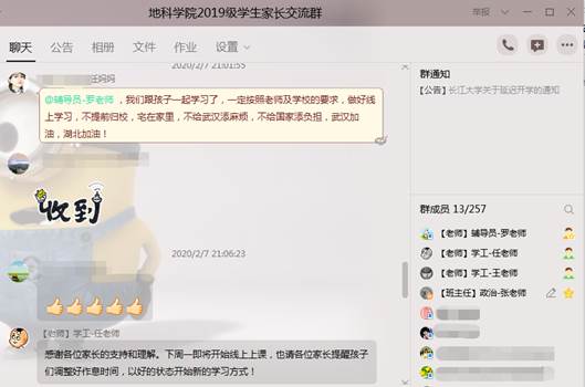 为了发挥家校联防联控的作用,学院在2月7日晚通过家校沟通平台,将学校疫情防控和网络课堂的情况在各年级家长群中通报,并要求家长配合做好各项配合工作,取得家长一致理解。资工21901班王任妈妈表示“晚上全家一起学习了班会,一定按照老师及学校的要求,做好线上学习。”