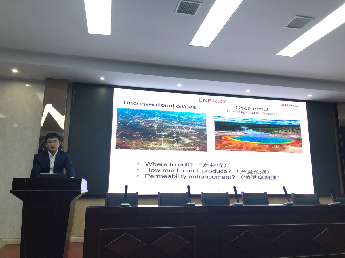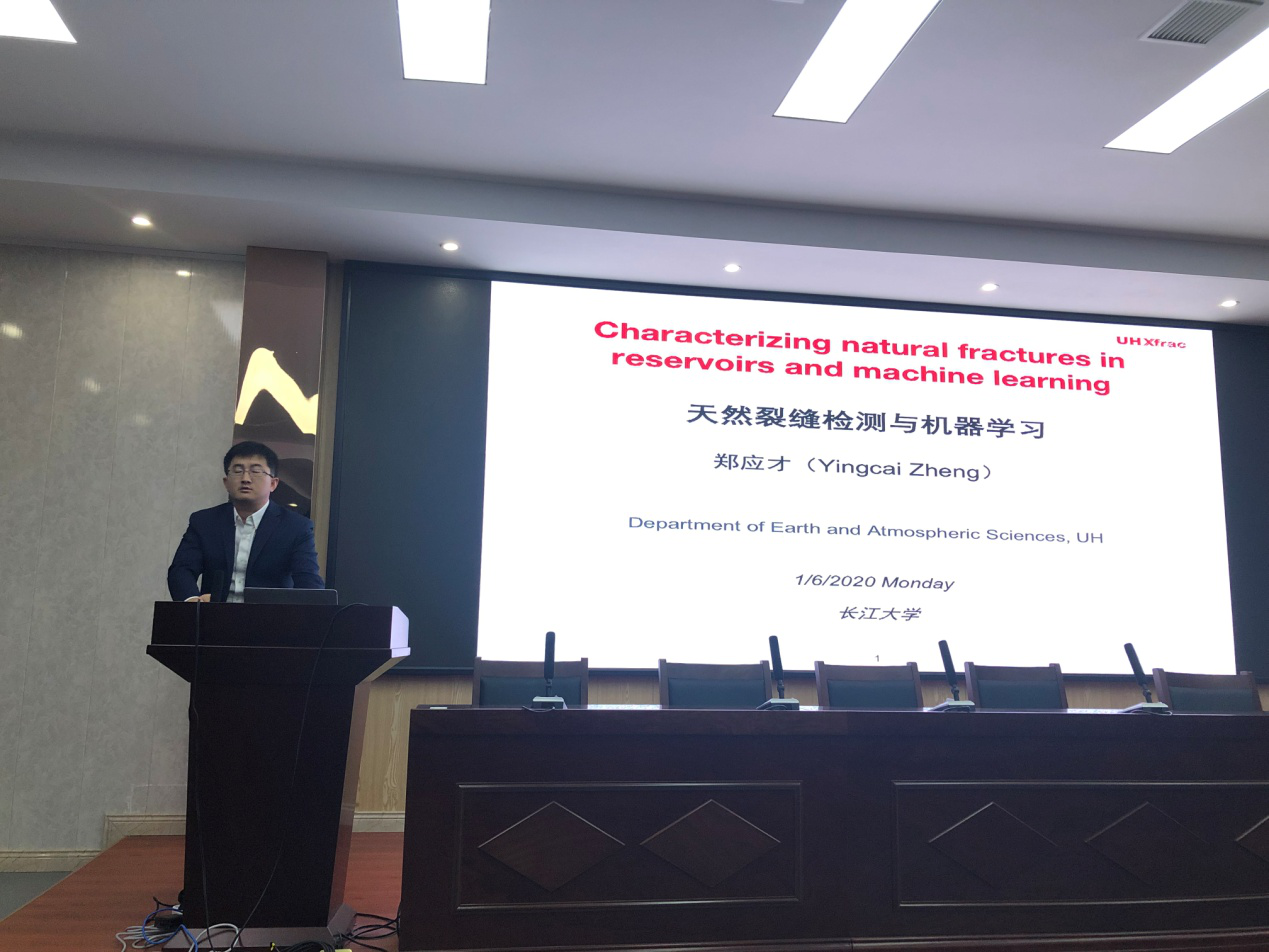 郑教授以全英文的标题 Characterizing natural fractures in reservoirs and machine learning引入讲座,从天然裂缝的检测和机器学习方法两个方面进行了讲述。从波段如何衍射、井位如何选取、产量如何预测等方面应用机器学习的方法展开了详细的论述。郑教授全英文的讲座既增加了学生学习专业英语的热情,又丰富了学生的国际视野。郑教授丰富的经历也给师生提供了更多的学术资源。