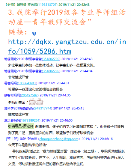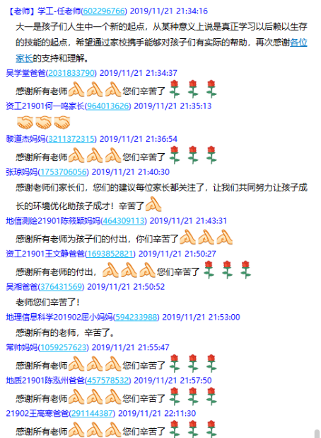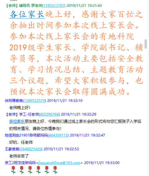 在2019级学生家长群召开了19级本科生第一次线上家长会,此次家长会由年级辅导员罗小玉主持,学院党委副书记任倩、辅导员王宁、潘志远、张严、辅导员助理周寒及255名学生家长共同参与了本次线上讨论。