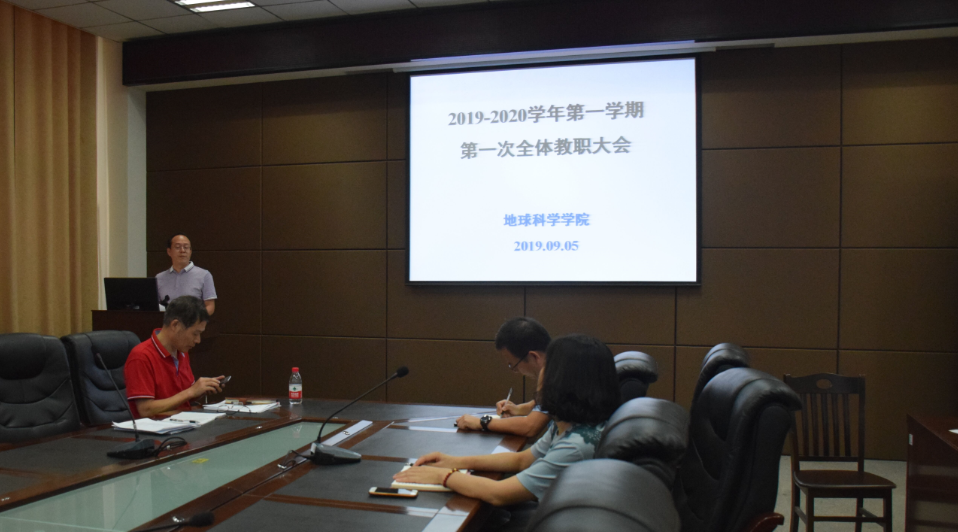在石油科技大楼B113会议室召开本学期第一次全体教职工大会,就2019年下半年各方面工作进行部署。会议由党委书记江万哲主持。