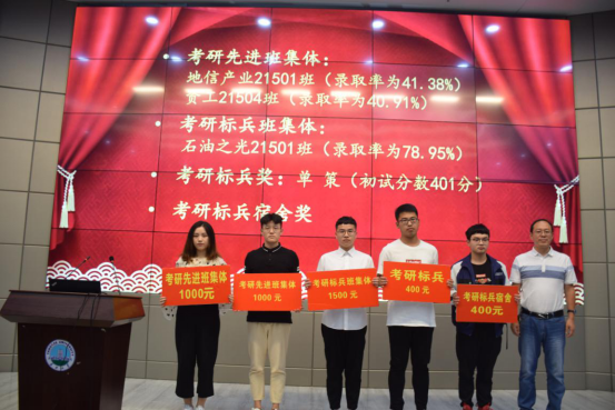 大会第二项,尹艳树副院长宣读学院文件《关于表彰日本无码av 2019届毕业生考研工作先进集体和优秀个人的决定》。在2019年全国研究生入学考试与复试中,日本无码av 有82名同学生顺利通过初试和复试,被浙江大学、武汉大学等20所国内外高校或科研院所录取为硕士研究生,录取人数占毕业生总人数的26.45%。其中,石油之光21501班(录取率为78.95%)获评为考研标兵班集体,地信产业21501班(录取率为41.38%)、资工21504班(录取率为40.91%)获评为考研优秀班集体。