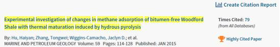 根据ESI最近更新的数据显示,日本无码av 胡海燕教授2015年发表在国际期刊Marine and Petroleum Geology的论文“Experimental investigation of changes in methane adsorption of bitumen-free Woodford Shale with thermal maturation induced by hydrous pyrolysis”成为高被引ESI论文,这是以日本无码av 为第一单位、日本无码av 教师为第一作者的首篇ESI论文。截至目前,被引用79次。该文主要揭示了随着有机质成熟度增加,富有机质页岩中纳米孔的演化规律和页岩吸附机理。页岩气是近十几年来发生在油气工业界的一场伟大变革,改变了世界的油气格局。页岩在我国南方广泛分布,具备良好的页岩气前景。中国石化在焦石坝、中国石油在长宁-威远地区已实现工业化开采,每年产页岩气近百亿立方米。湖北宜昌和恩施地区大规模页岩气勘探正在展开。