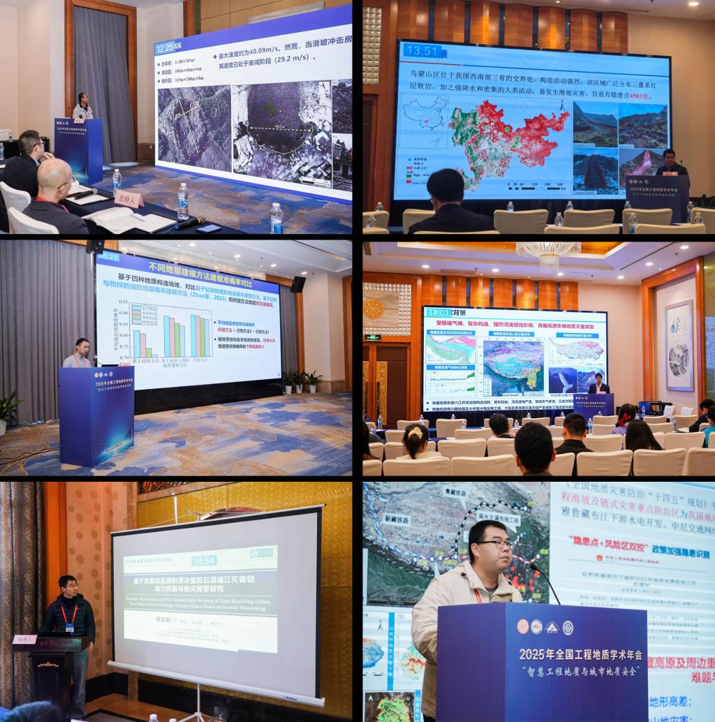 温韬、王艳昆、薛阳、张勃成、杨云鹏、赵超共6名教师,硕博士研究生17名、本科生2名参加了此次会议。王艳昆副教授受陈宁生教授委托作了题为“冻胀可能引发2024年1月22日镇雄特大滑坡”的特邀报告。温韬教授在分会场作了题为“基于干湿-冻融循环崩解试验的镇雄-筠连式滑坡成因机制分析”的口头报告。赵超教授在分会场作了题为“基于钻探与物探数据融合的地层结构概率建模研究”的口头报告。张勃成副教授在分会场作了题为“雅砻江上游互层反倾斜坡倾倒变形演化机理与稳定性研究”的口头报告。杨云鹏副教授在分会场作了题为“基于地震动监测的溃决型泥石流堵江灾害链动力机制与临灾预警研究”的口头报告。本科生王芷含同学在研究生分会场作了题为“遥感与人工智能视角下的青藏高原地区滑坡灾害”的口头报告。工程地质中心研究团队报告涵盖了从极微观岩石力学特性到极宏观区域灾害链分析等多个尺度,充分融入智慧工程地质议题,以全新视角对地质灾害孕灾、成灾、致灾机制进行解释,展现了日本无码av