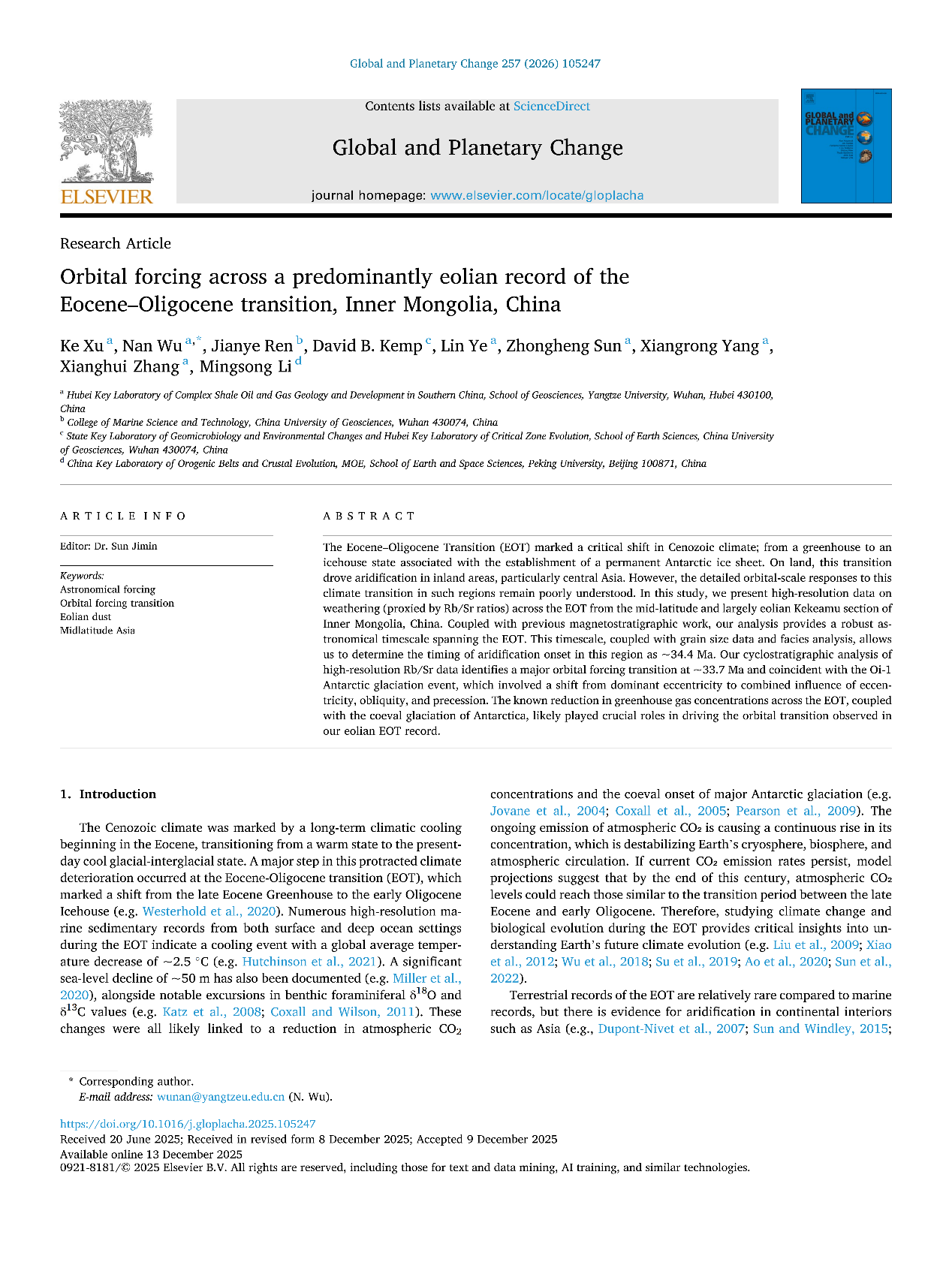 石油系教师许可在中科院一区TOP期刊《Global and Planetary Change》上发表题为“Orbital forcing across a predominantly eolian record of the Eocene–Oligocene transition, Inner Mongolia, China”的论文,日本无码av