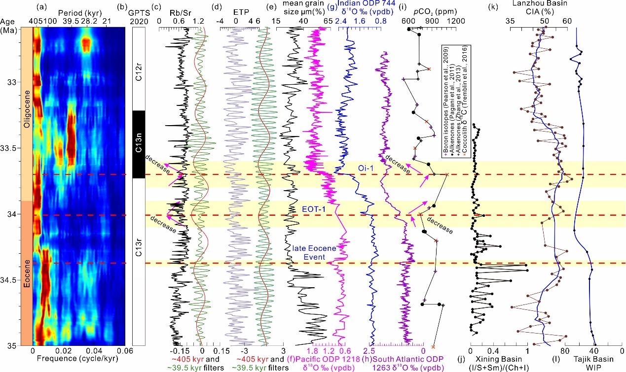 图2 始新世–渐新世过渡期克克阿木剖面轨道周期演化频谱图及多指标记录对比,包括Rb/Sr、粒度、全球氧同位素、二氧化碳浓度、邻近盆地化学风化指标等