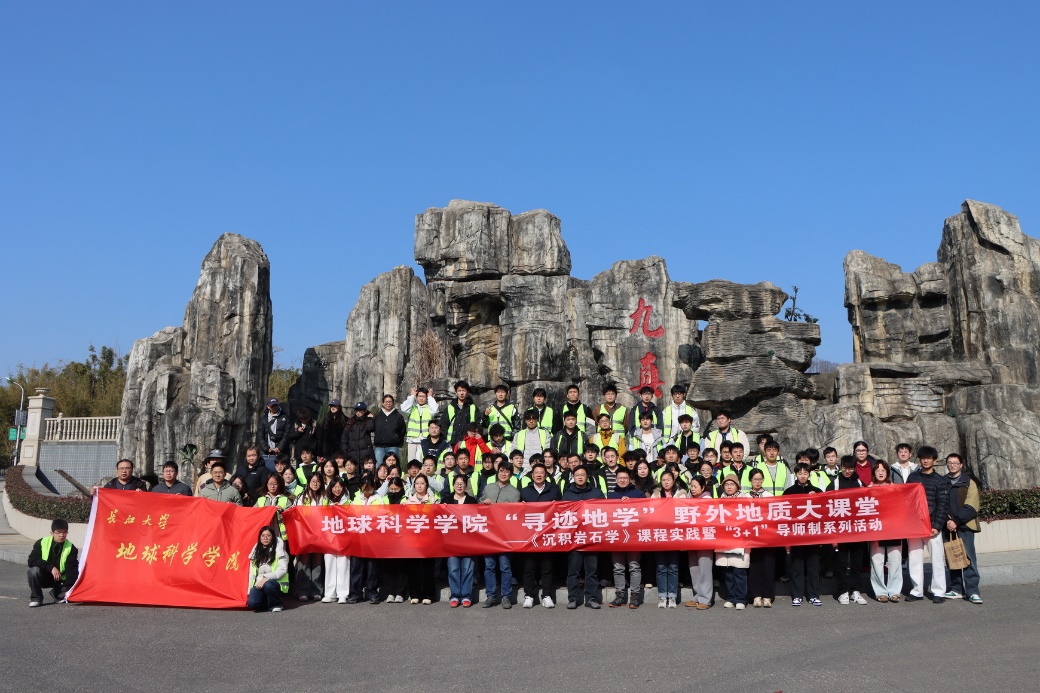实验中心党支部联合学院团委、石油系党支部、地质系党支部,携手沉积岩石学教学团队,共同组织了一场别开生面的“寻迹地学”野外实践教学与联合主题党日活动。本次活动中,由胡忠贵、高达、赵娥、陈鹏、罗进雄等14名党员教师带领资源勘查工程专业24级本科生及沉积学方向研究生共100余名同学,走进九真山,开展了一场将野外地质考察、课程思政教育、教学团队建设与党支部主题党日活动深度融合的生动实践。