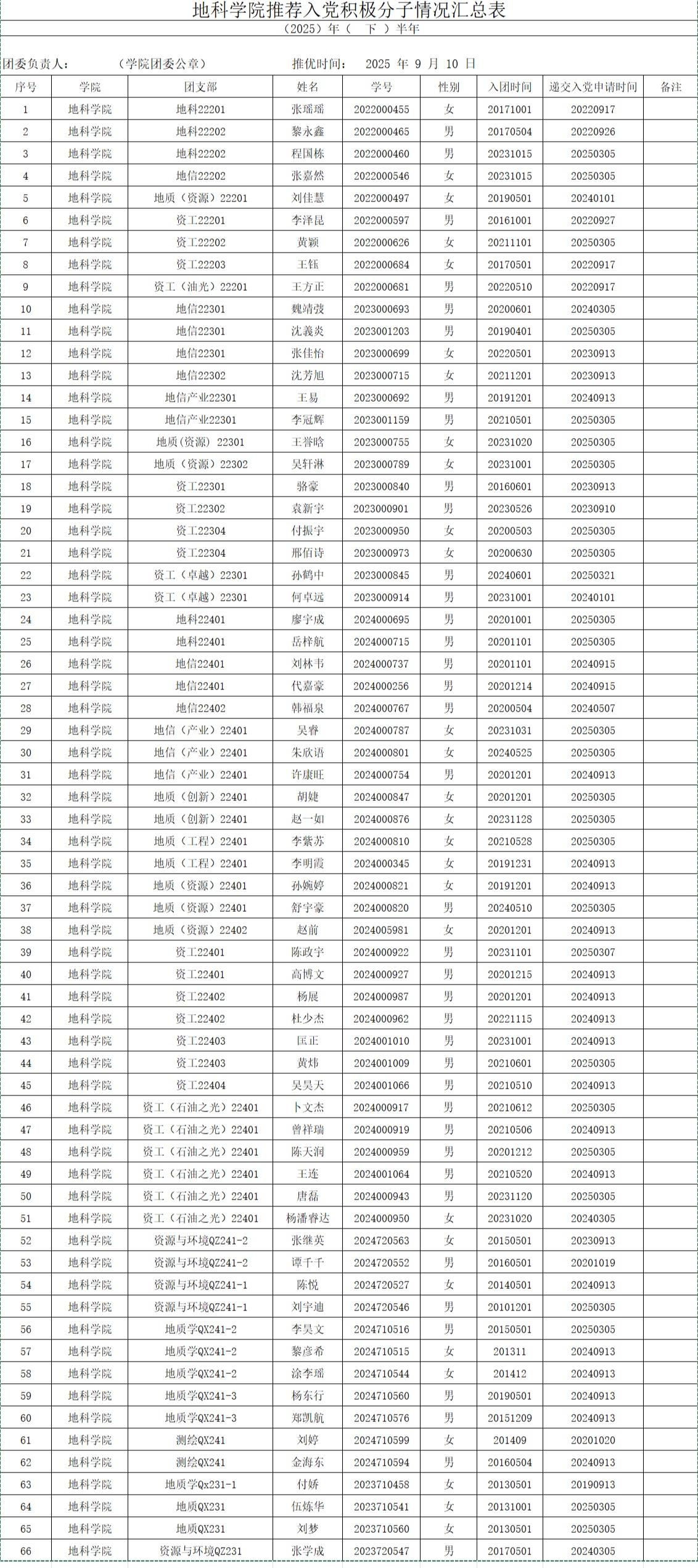 推荐入党积极分子情况汇总表