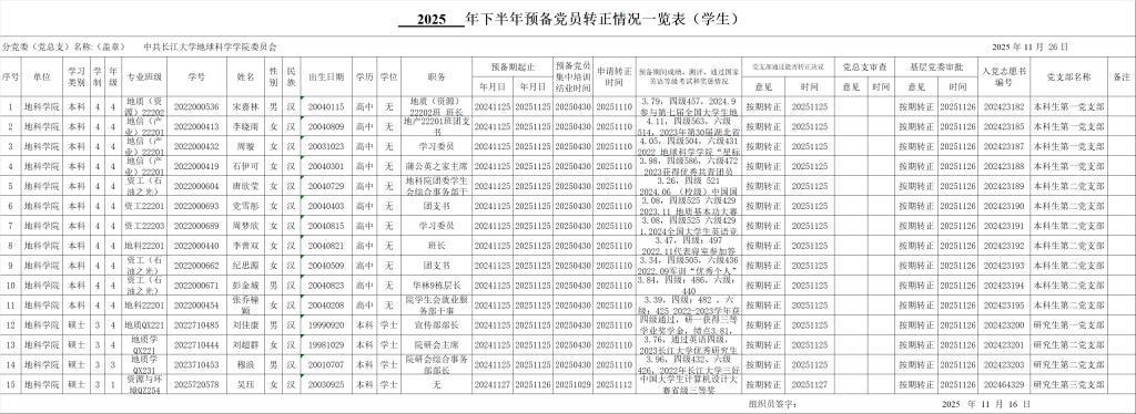 经过党支部对预备党员1年的培养教育和考察,经支部委员会研究确定,报分党委(党总支、党工委)审查同意,将于近期召开党员大会讨论宋嘉林等15名同志预备党员转正,特在全院范围内进行公示。