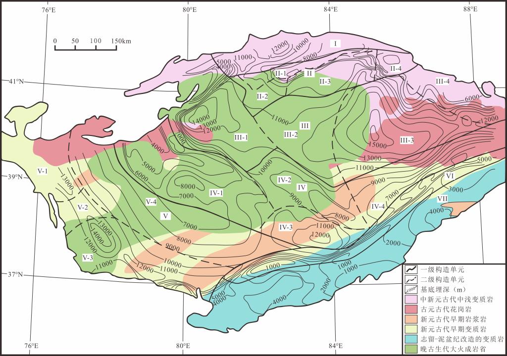 图2 塔里木盆地构造单元划分、基底岩性和厚度图