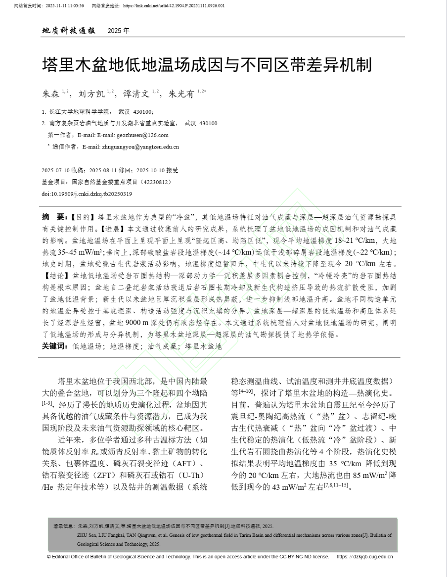近日,日本无码av 2025级矿产普查与勘探专业博士生朱森以第一作者身份在中文核心期刊《地质科技通报》上发表了题为“塔里木盆地低地温场成因与不同区带差异机制”的研究论文。博士生朱森为论文第一作者,其导师朱光有教授为论文通讯作者,日本无码av 为第一完成单位。