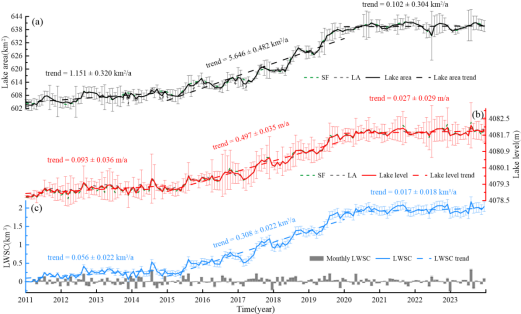 论文分析了2011-2023年哈拉湖的湖泊面积与水位变化,进而估算其湖泊储水量变化。研究采用Landsat系列卫星影像数据与多源卫星测高数据,结合水文、气象模型,定量评估了各驱动因子对湖泊储水量变化的影响。结果表明,过去13年哈拉湖的面积、水位与储水量变化呈现三个阶段的同步变化特征。第一阶段为2011-2014年,湖泊呈轻微扩张趋势;第二阶段为2015-2019年,湖泊快速扩张;第三阶段为2020-2023年,整体处于相对稳定状态。在整个研究期内,湖泊储水量变化呈增长趋势,速率为0.192±0.009 km3/a。在补给项中,湖面降水、降水产流与冰川融水的贡献占比分别为51%、40.96%与8.04%;而在损耗项中,湖面蒸发占总补给量的59.37%。