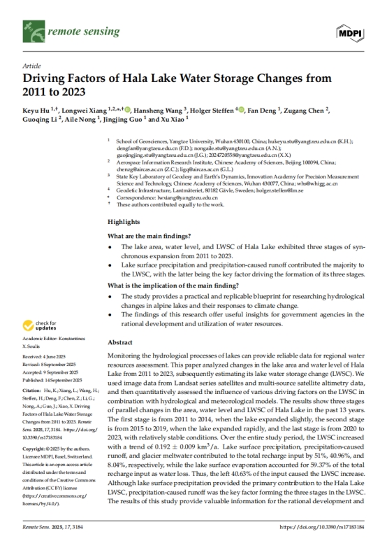 硕士研究生胡苛榆在相龙伟副教授的指导下,在期刊《REMOTE SENSING》上发表题为‘Driving Factors of Hala Lake Water Storage Changes from2011 to 2023’的研究论文。
