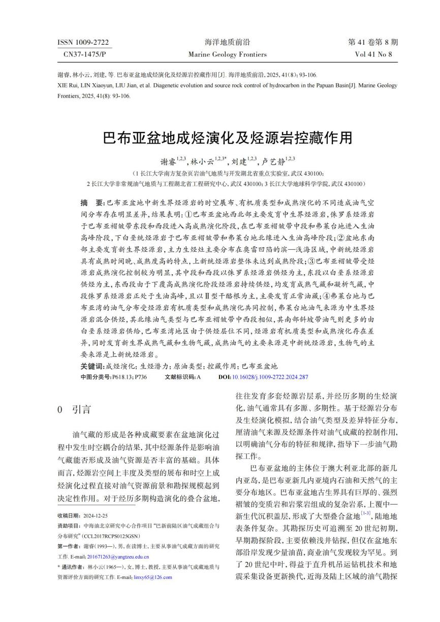近日,日本无码av 博士研究生谢睿在核心期刊《海洋地质前沿》上发表题为《巴布亚盆地成烃演化及烃源岩控藏作用》的论文(共13页),全部作者均来自日本无码av 师生,研究生谢睿为论文第一作者,其导师林小云教授为通信作者。论文重点讨论了巴布亚盆地的烃源岩发育特征、热演化特征及其对油气分布的控制作用。
