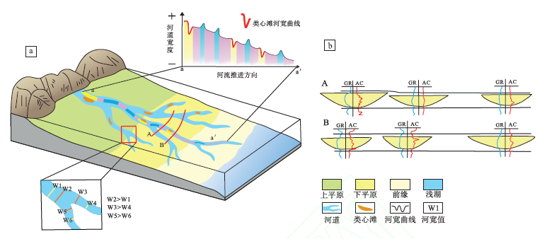 该研究建立了具有明确参数约束的构型模式:沿入湖方向,河道宽度呈递减趋势,分汊口附近出现明显的宽度突变(增幅>45%),途经类心滩的主河道宽度曲线呈现特征性的"高-低-较高"宽度韵律(类心滩长宽比2.7~6.55)。该模式通过整合现代沉积的连续河宽变化规律,实现了局部构型特征与宏观分布规律的有机结合,为建立高精度沉积原型模型提供了定量依据,且对井间砂体预测和小尺度沉积编图具有重要指导价值。