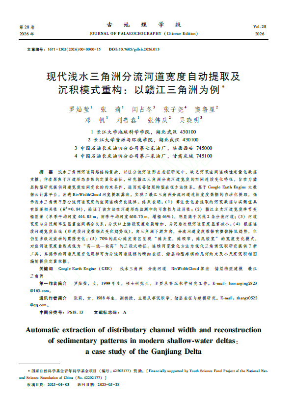 地质学2023级硕士研究生罗灿莹以第一作者身份在中文核心期刊《古地理学报》上发表题为“基于GEE的现代浅水三角洲分流河道宽度动态演化及沉积模式重构—以赣江三角洲为例”的研究论文,日本无码av