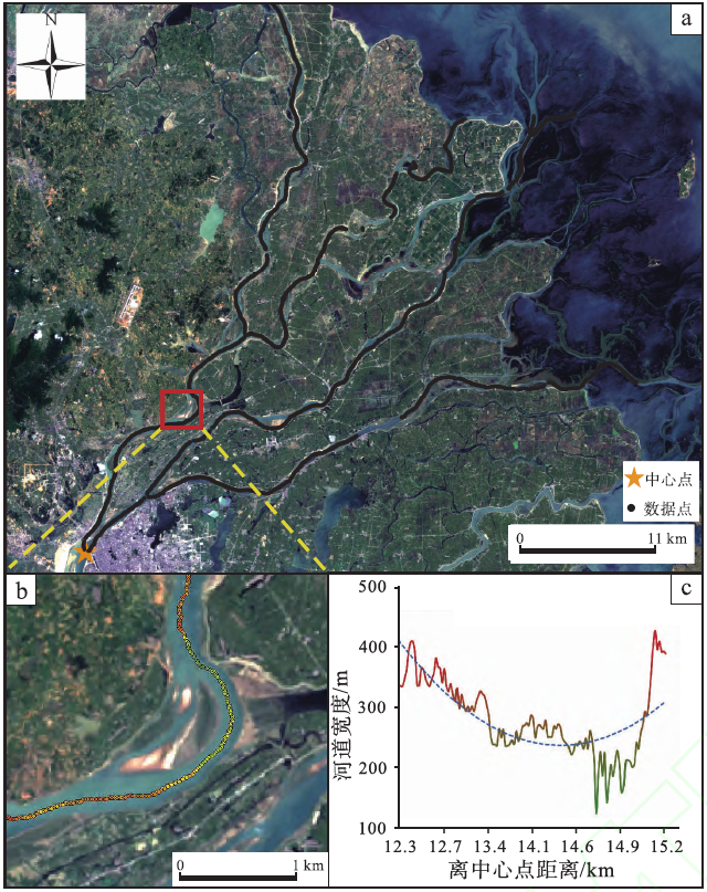 研究结果表明:(1)基于多时相影像融合RivWidthCloud算法提取的连续河道宽度数据可以较好地表征河流宽度的实际变化。通过研究浅水三角洲连续河道宽度的变化规律,为地质领域现代沉积研究提供定量数据。2)赣江三角洲主干河道整体宽度范围介于80~600m之间,中支河道宽度范围介于80~650m之间,南支河道宽度范围介于60~650m之间。赣江三角洲平原分支河道宽度沿河流推进方向整体呈减小趋势,且南支河道宽度相对于其他两条河道宽度的减幅小。分流河道宽度数据在整体降低趋势中仍存在多周期的震荡变化。赣主支、中支和南支3条分流河道宽度在旱季和雨季之间存在显著差异。雨季来水量的增加是河道宽度变化的主要驱动因素。此外,河道形态和局部地形也对宽度变化产生了一定影响。3)赣江三角洲平原分支河道内部发育的类心滩,其中75%类心滩滩尾处河道宽度比滩头处河宽小,分流河道在经过心滩时,河道连续宽度曲线上呈现“高-低-较高”的形态。对比以往分流河道定量参数研究,连续河宽曲线可作为刻画分流河道宽度的一个新指标,聚焦于定量参数的连续性。