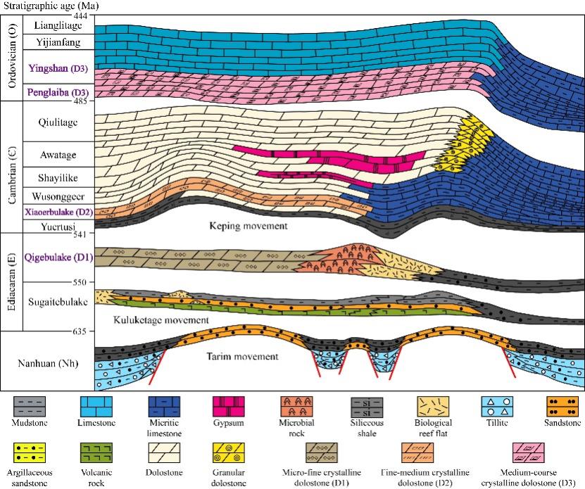 图 2.从埃迪卡拉纪至奥陶纪期间塔里木盆地内的构造活动与地层组成