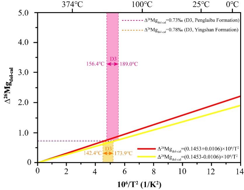 研究结果表明:微-粉晶白云石(D1)的δ26Mg值范围为−1.98到−1.69‰,细-中晶白云石(D2)为−1.68到−1.33‰,中-粗晶白云石(D3)为−2.35到−1.99‰。根据镁同位素平衡分馏温度方程,Δ26Mgdol−fluid= −0.1554(±0.0096) ×106/T2或 Δ26Mgdol−cal= 0.1453(±0.0106) × 106/T2,计算得到D1的形成温度范围为45.0到65.4°C,D2为53.1到73.9°C,D3为142.4到173.9°C 或 156.4到189.0°C(图3和图4)。这些温度估算值与先前文献中相同地层的流体包裹体和耦合同位素研究所得的温度结果接近,支持了镁同位素作为白云石形成温度测定方法的可靠性。本研究提出了一种创新的方法,利用镁同位素评估白云石的形成温度,为解决“白云石问题”提供了重要的见解。