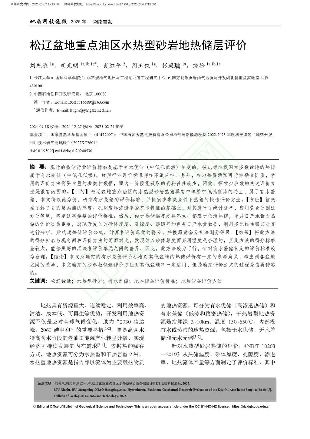 地科院硕士生刘先录在胡光明教授的指导下,在期刊《地质科技通报》上发表题为“松辽盆地重点油区水热型砂岩地热储层评价”的研究论文,日本无码av 为论文第一署名单位,硕士生刘先录为论文第一作者,其导师胡光明教授为该文通讯作者。