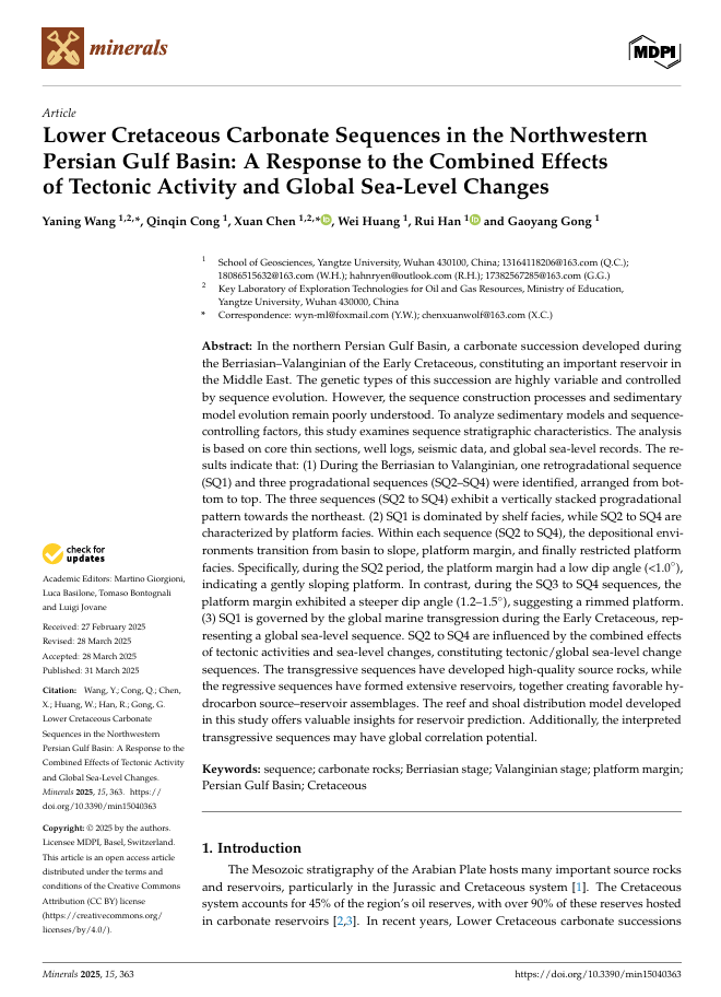 中东地区作为全球油气资源最丰富的区域之一,其碳酸盐岩储层一直是地质学家关注的焦点。波斯湾盆地早白垩世(贝利阿斯期-瓦兰今期)发育的碳酸盐岩层序是重要的油气储层,但长期以来,其层序构建过程和沉积模式演化机制尚不明确。该研究针对波斯湾盆地北缘下白垩统碳酸盐岩层系,提出了构造活动与全球海平面变化联合响应作用于该时期层序建设,构建了这一关键地质时期的碳酸盐岩沉积格局。