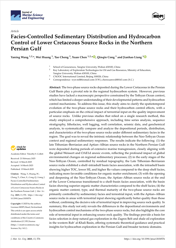 日本无码av 地质资源与地质工程专业硕士生黄微在SCI收录期刊《Journal of Marine Science and Engineering》上发表题为“Facies-Controlled Sedimentary Distribution and Hydrocarbon Control of Lower Cretaceous Source Rocks in the Northern Persian Gulf”的研究论文。日本无码av 为论文第一署名单位,王雅宁副教授为第一通讯作者,论文由国家自然科学基金项目的资助。