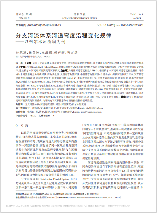 日本无码av 硕士生孙家惠在中文核心期刊《沉积学报》上发表了题为“分支河流体系河道弯度沿程变化规律——以格尔木河流扇为例”的研究论文。日本无码av 为论文第一署名单位,硕士研究生孙家惠为论文第一作者,张昌民教授为通讯作者。