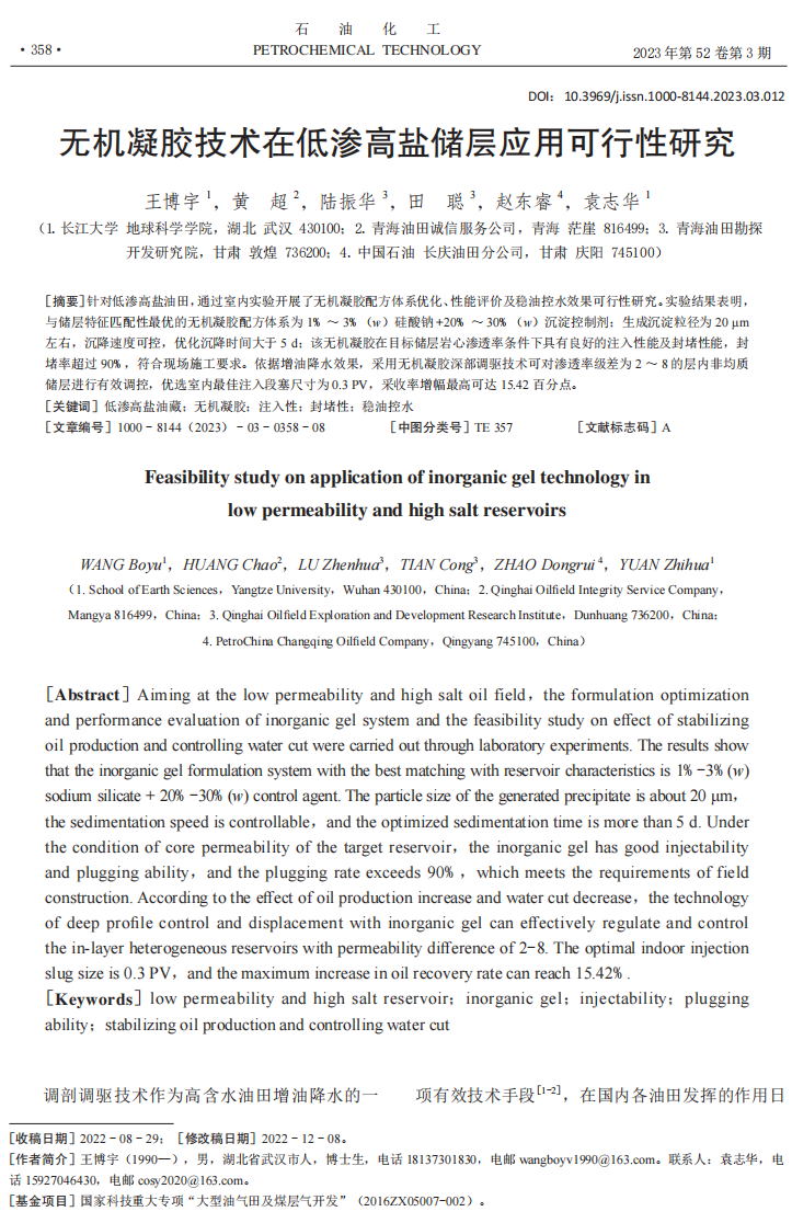 博士生王博宇在《石油化工》上发表题为《无机凝胶技术在低渗高盐储层应用可行性研究》的论文。日本无码av