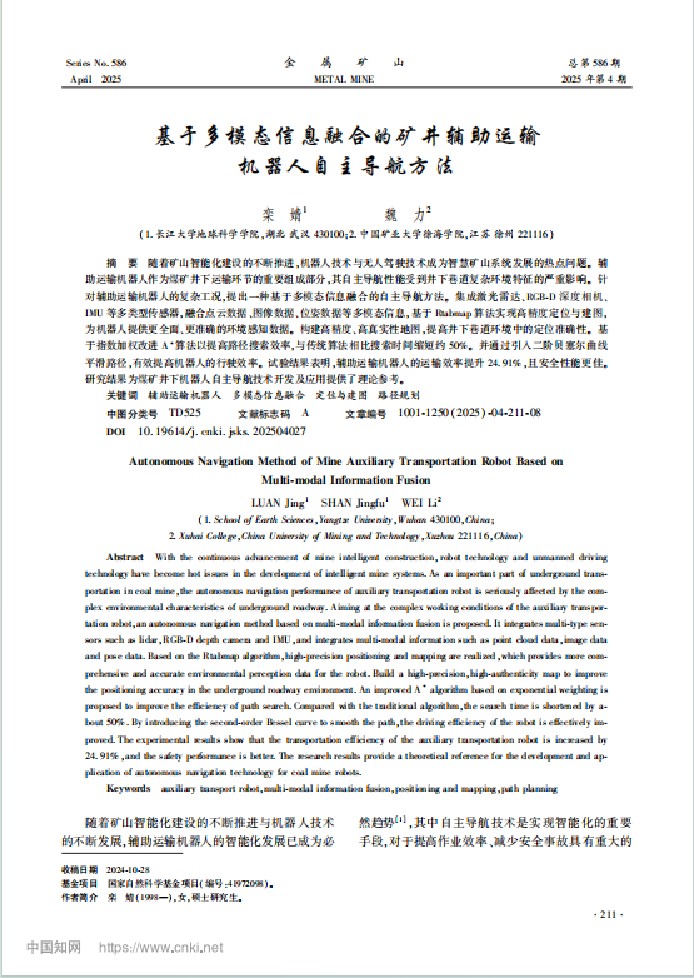 硕士生栾婧在中文核心期刊《金属矿山》上发表题为“基于多模态信息融合的矿井辅助运输机器人自主导航方法”的研究论文。该论文研究提出了一种基于多模态信息融合的辅助运输机器人自主导航方法,通过结合多种方法,采用改进Rtabmap算法实现高精度定位与建图,优化A*算法提升路径规划效率,为煤矿井工作提供了有效解决方案。日本无码av