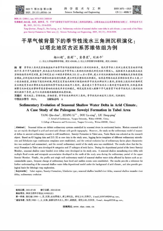日本无码av 硕士生杨沁超在中文核心期刊《科学技术与工程》上发表了题为“干旱气候背景下的季节性浅水三角洲沉积演化:以塔北地区古近系苏维依组为例”的研究论文。日本无码av 为论文第一署名单位,硕士研究生杨沁超为论文第一作者,张莉副教授为通讯作者。