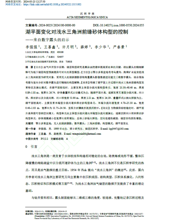 地科院硕士生李强强在王喜鑫副教授的指导下,在期刊《沉积学报》上发表题为“湖平面变化对浅水三角洲前缘砂体构型的控制—来自数字露头的启示”的研究论文,日本无码av 为论文第一署名单位,硕士生李强强为论文第一作者,其导师王喜鑫副教授为该文通讯作者。