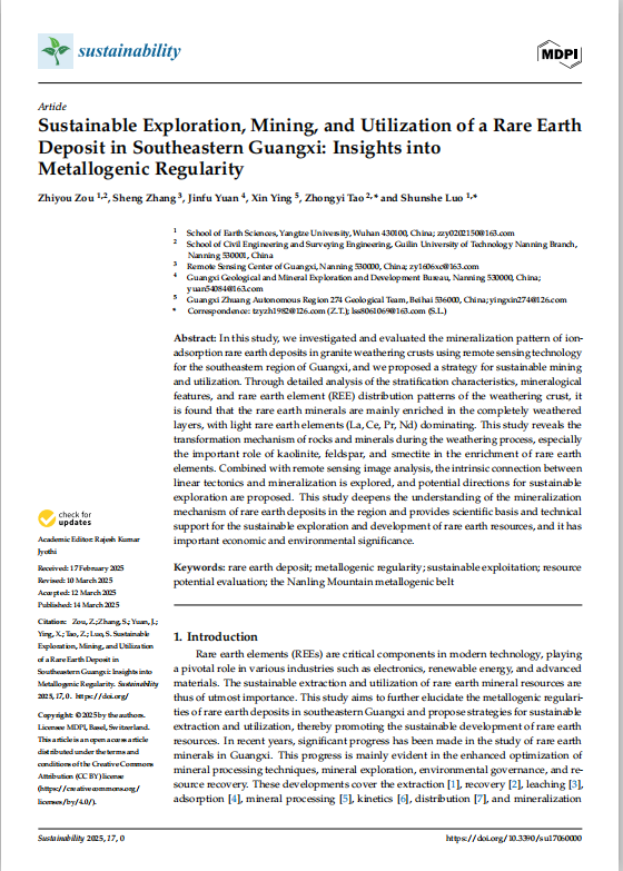 博士生邹志友相关研究成果以“Sustainable Exploration, Mining, and Utilization of a Rare Earth Deposit in Southeastern Guangxi: Insights into Metallogenic Regularity”为题,发表于《SUSTAINABILITY》期刊。该研究针对广西东南部稀土矿床,系统揭示了离子吸附型稀土矿的成矿规律,并对该矿区提出了可持续开发策略,为稀土资源的高效利用与生态保护提供了参考。