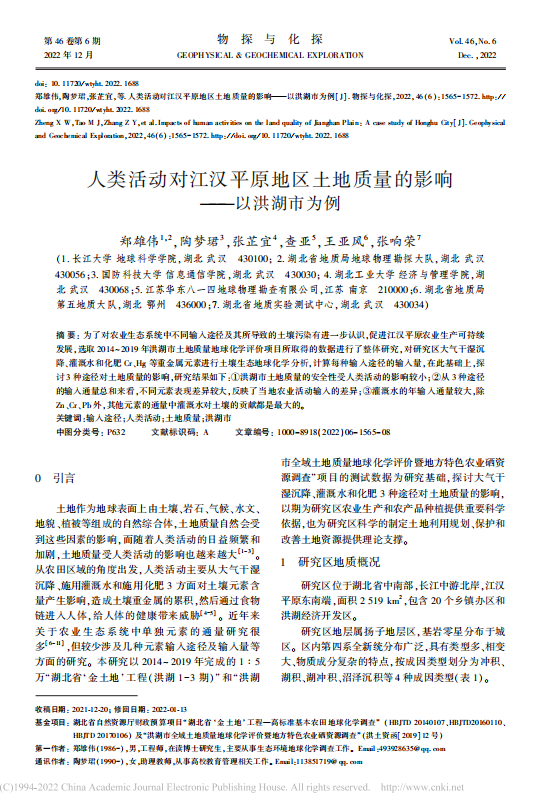 博士生郑雄伟在《物探与化探》上发表题为“人类活动对江汉平原地区土地质量的影响-以洪湖市为例”的研究论文。该论文通过选取 2014~ 2019 年洪湖市土地质量地球化学评价项目所取得的数据进行了整体研究,对研究区大气干湿沉降、灌溉水和化肥 Cr、Hg 等重金属元素进行土壤生态地球化学分析,计算每种输入途径的输入量,探讨 3 种途径对土地质量的影响,为研究区农业生产和农产品种植提供了重要科学依据,也为研究区科学的制定土地利用规划、保护和改善土地资源提供了理论支撑。