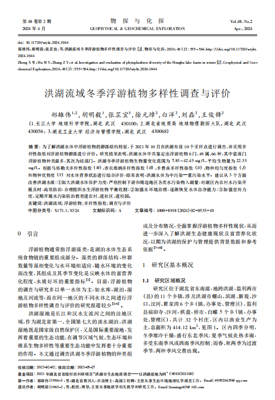 博士生郑雄伟在《物探与化探》上发表题为“洪湖流域冬季浮游植物多样性调查与评价”的研究论文。该论文通过调查洪湖冬季浮游植物的种类组成及分布情况,全面掌握了浮游植物多样性现状,深入研究了洪湖生态健康现状及富营养化状况,为洪湖的保护与管理提供了背景数据和参考依据。