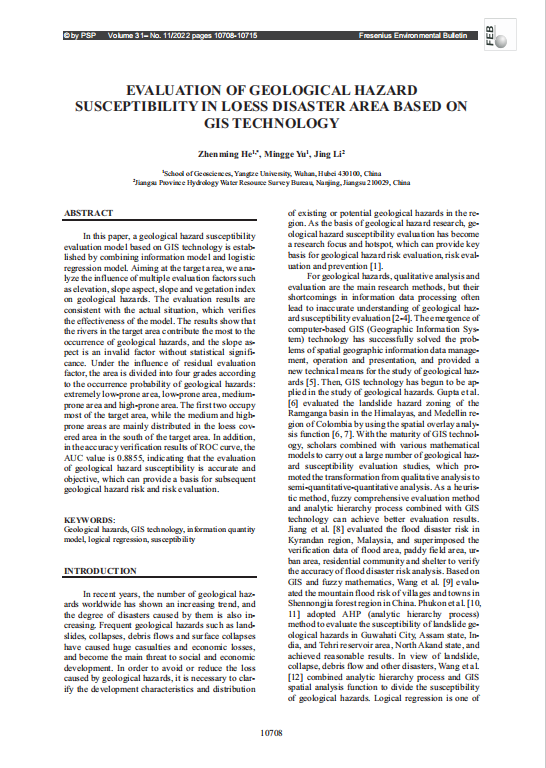 研究生于茗鸽以第二作者身份在环境科学领域SCI期刊《Fresenius Environmental Bulletin》上发表了题为“EvaluationofGeologicalHazardSusceptibilityinLoessDisasterAreaBasedonGISTechnology”的研究论文。该论文以日本无码av