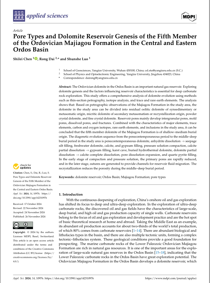 博士生陈世磊在《Applied Sciences》上发表题为“Pore Types and Dolomite Reservoir Genesis of the Fifth Member of the Ordovician Majiagou Formation in the Central and Eastern Ordos Basin”的研究论文。文章综合运用铸体薄片、碳酸盐岩碳氧同位素、、阴极发光、微量元素、稀土元素及流体包裹体等分析测试方法,并结合构造背景、沉积微相及成岩作用等资料,深入剖析白云岩的成因机理。分析表明,(1)受到海平面升降和中央古隆起的阻挡作用控制,研究区内奥陶系马家沟组五段膏盐下白云岩储层在短期海退和短期海进具有明显的差别,纵向上具有旋回性,依据研究区内大量马家沟组白云岩薄片镜下观察鉴定结果,研究区内白云岩可分为同沉积或交代成因的残余鲕粒白云岩,次生交代或重结晶成因的泥晶白云岩,粉晶白云岩和细晶白云岩。储层孔隙主要发育晶间孔、铸模孔、溶孔和裂缝。(2)马家沟组五段白云岩主要由准同生白云岩、埋藏白云岩及热液白云岩组成。根据地球化学特征结合岩石学特征,确定马家沟组五段白云石Sr含量平均值为407.3×10-6,具有低Fe、低Mn、高Sr、高Na的特点,稀土元素含量为0.01×10-6-21.8×10-6,具有典型碳酸盐岩低稀土元素含量特征,δ13C的含量介于-2‰-2‰之间δ18O的含量介于-12‰到-4‰之间,说明其成岩环境为埋藏环境。(3)研究区内从准同生期到中-深埋藏期的成岩演化序列为:准同生白云石化、硬石膏溶解→渗流粉砂充填、淡水白云化、方解石和石膏充填、压溶压实作用、方解石部分溶解→石膏充填、溶缝溶孔溶洞、埋藏热液白云化、白云石部分溶蚀→方解石完全溶蚀、孔隙溶蚀扩大、石英黄铁矿充填。其中压实压溶作用早期使原生孔隙迅速减少,后期则产生缝合线等为储层流体运移提供通道;重结晶作用则在中-深埋藏期使孔隙减少。