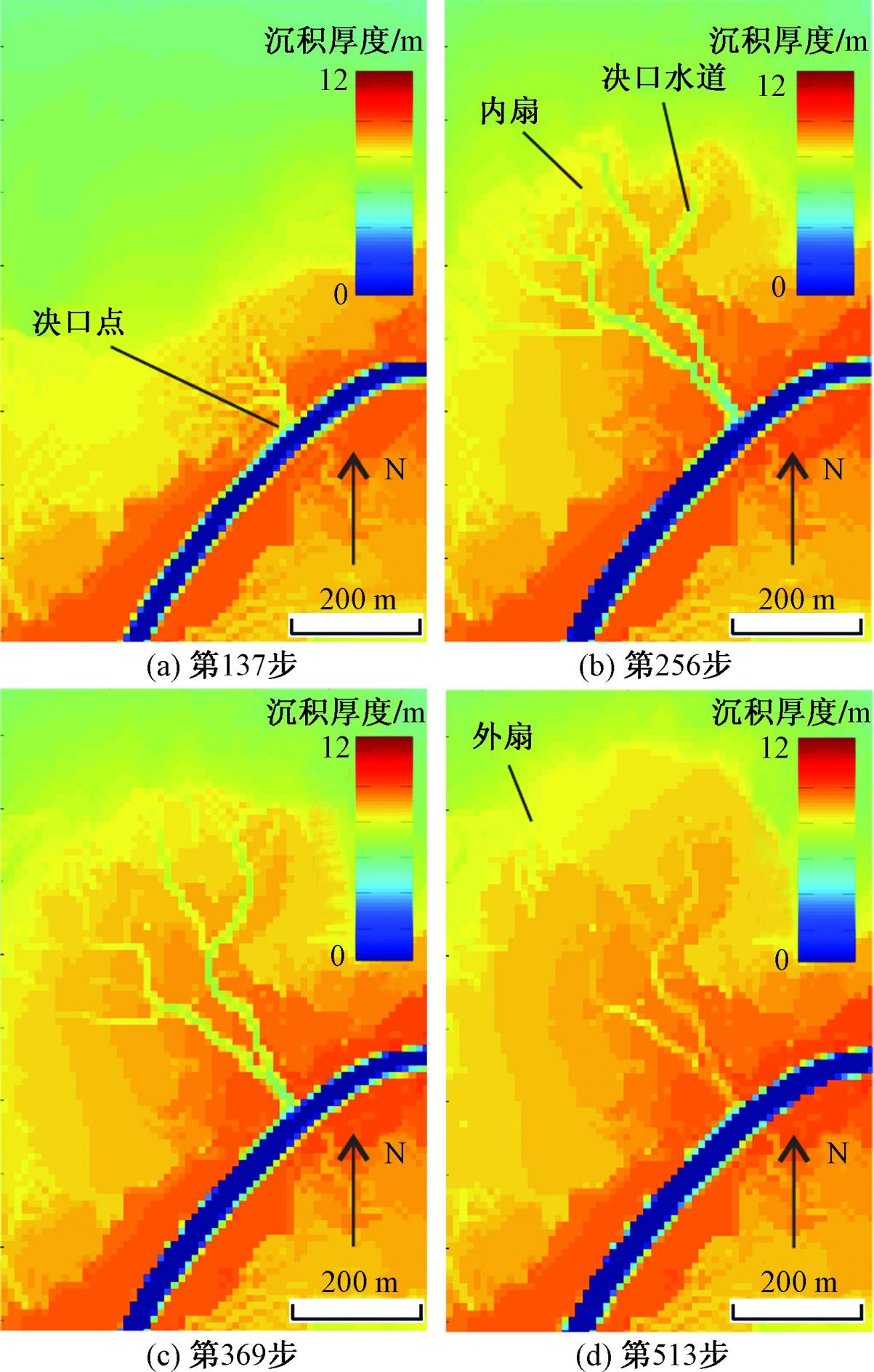 该研究基于卫星影像与野外实地勘测,结合国际领先的Delft3D沉积数值模拟技术,成功还原了决口扇从形成到消亡的全过程。研究表明,东营子决口扇由决口水道、复合内扇与外扇三部分组成,其演化受气候干湿变化驱动,可分为四大阶段:决口爆发期;内扇萌芽期;内扇繁盛期;外扇形成期。