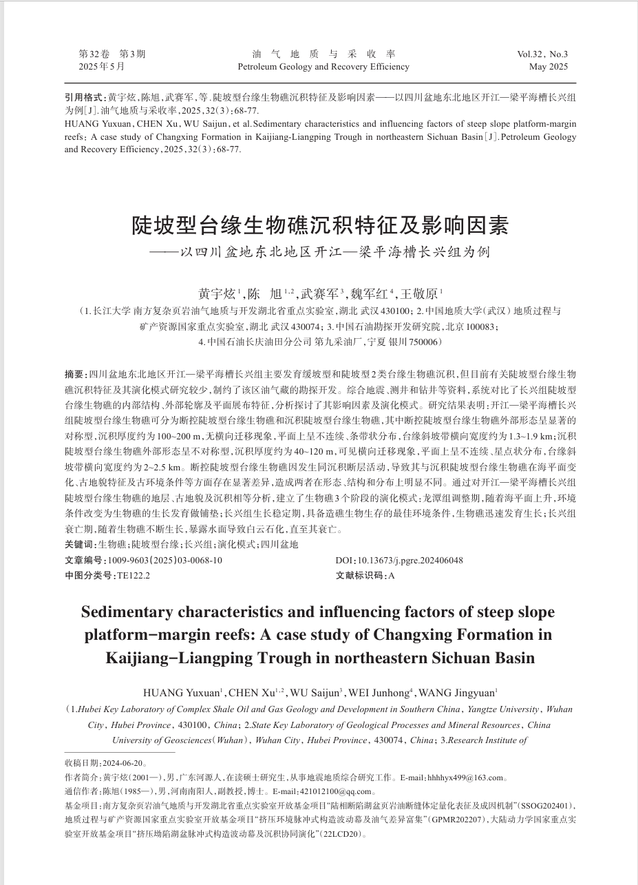 四川盆地东北地区开江—梁平海槽长兴组主要发育缓坡型和陡坡型2类台缘生物礁沉积,但目前有关陡坡型台缘生物礁沉积特征及其演化模式研究较少,制约了该区油气藏的勘探开发。该论文综合地震、测井和钻井等资料,系统对比了长兴组陡坡型台缘生物礁的内部结构、外部轮廓及平面展布特征,分析探讨了其影响因素及演化模式。