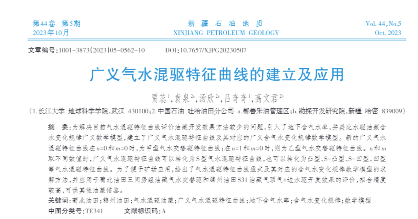 2023年9月26日,日本无码av 22级硕士研究生贾蕊在《新疆石油地质》上发表题为“广义气水混驱特征曲线的建立及应用”的研究论文,日本无码av 为论文第一署名单位,硕士研究生贾蕊为论文第一作者。